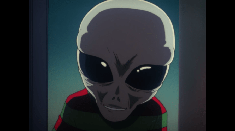 - A pretty typical representation of an alien shows up at Lain’s door. Nothing’s a surprise anymore in this show, and especially this appearance, as it’s hot on the heels of Roswell and the Majestic 12 being mentioned. Okay, maybe the shirt (Freddie Kruger-esque?) is surprising.