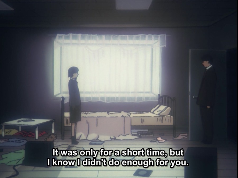 The first to express love is Yasuo, Lain’s “father.” Layer nine confirmed what we’d known for quite some time—Lain has been adopted into this family, and at nearly the age she is now. Miho and Yasuo are actors, pretending to be Lain’s parents, and the real world image of Lain is in fact a “homunculus.” As Lain comes ever closer to the edge of insanity, returning to her unkempt home and seeing dead plants that represent her dying world and the loss of her family, she’s rescued by her father. Yasuo is by no means a good dad, but there’s no doubt that he cares for Lain. He tells her so and then immediately exits. It’s not a touchy-feely scene, but it helps Lain return to a better road, one in which she keeps her sense of self.