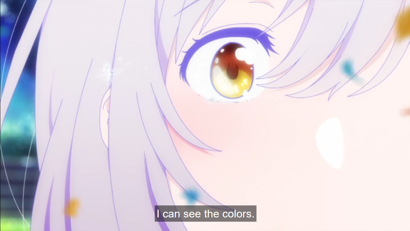 Hitomi is a mage with a problem that is possibly or possibly not related to her use of magic. Where once she could see in color, Hitomi now only sees the world in monochrome. At first, this plot element feels a bit kitschy. The initial episode swings us between full color and short black/white/grey scenes to remind of of her colorblindness. Of all the unique elements in the episode one—the others being the time travel mechanism, an automated vision of the future, and the everyday use of magic—this was the one that was most problematic. That is, at least, not until the final scene, which was absolutely breathtaking.
