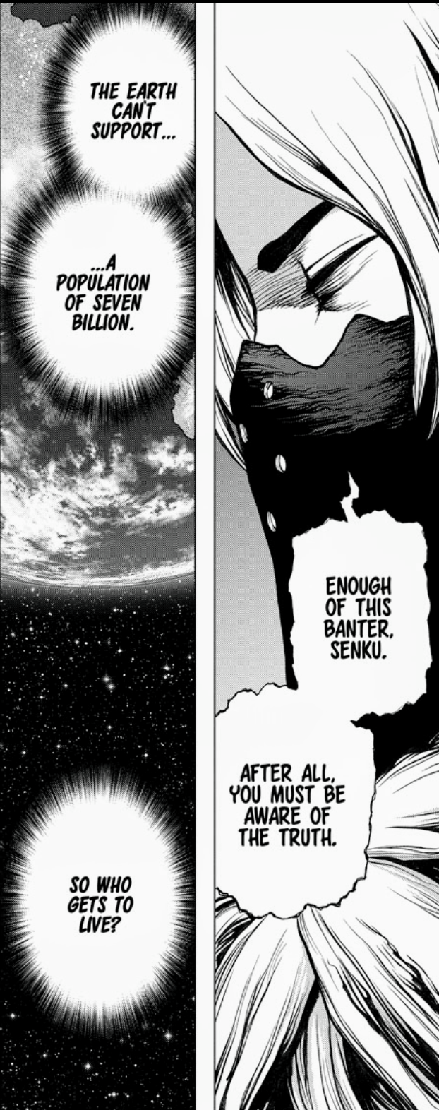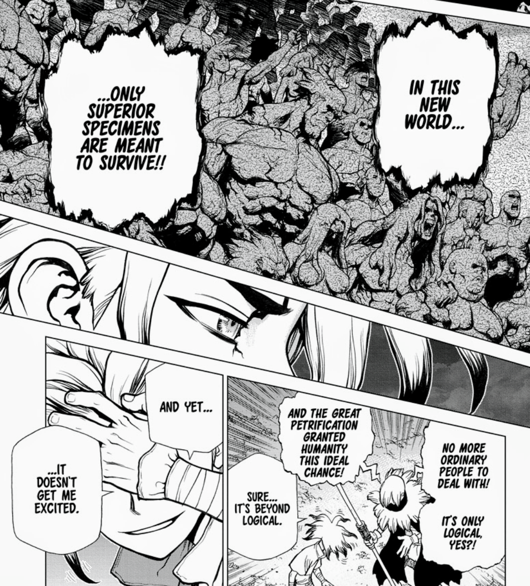 I was struck that here it is the scientist who rejects the ‘logical’ argument, which is a purely utilitarian (“usefulness-based”) way of thinking about things. Senku does not see science as replacing greater goods like human life, nor as justifying the rejection of charity towards our neighbor. For as much as he has trumpeted the glory of science up until this point, when the chips are down he values science in the service of human life and dignity.