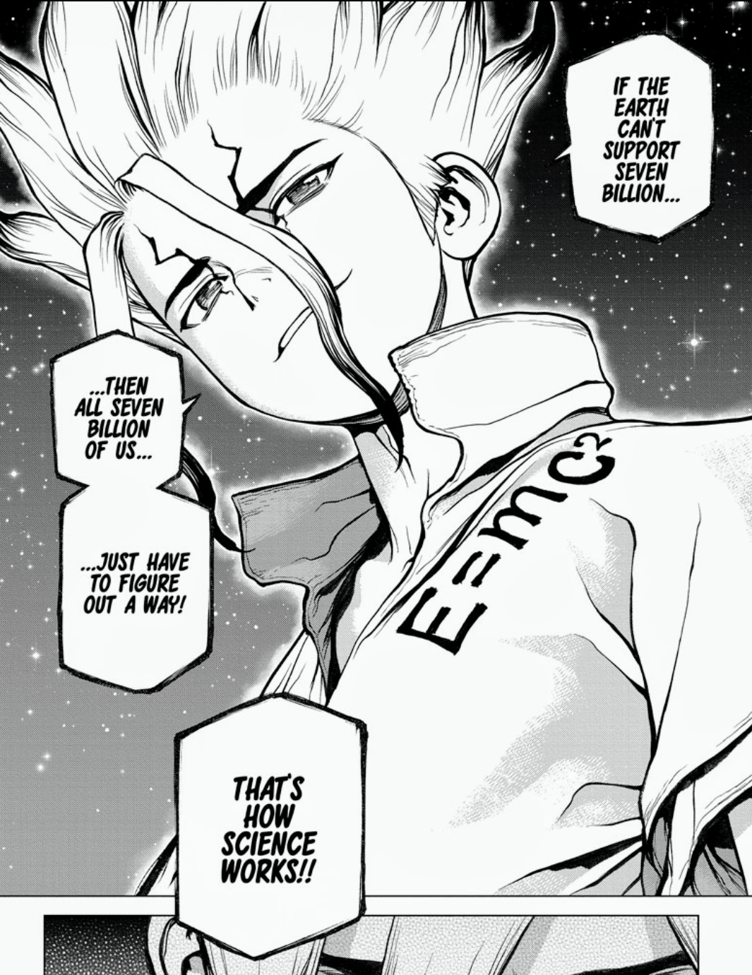 Enter Senku, one such leader who is something of a genius. For seventy-nine chapters, he’s been proclaiming that he will build a civilization of SCIENCE!, and has largely made good on that promise: He’s guided his tribe to (re)develop everything from glass-blowing to radios to automobiles.