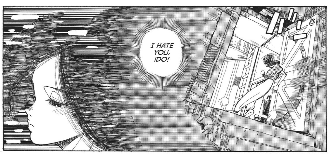 The opening chapters to the story introduce us to Alita, a cyborg found in a scrapheap by Ido, a doctor/engineer who restores her after the discovery. There are lots of the ways I imagined the story might evolve, but it goes a direction I wasn’t expecting—after Ido repairs Alita and discovers that she is a fighting machine, he tries to halt her progress toward that end, even though he himself hunts down criminal cyborgs. Ido doesn’t fall in love with Alita, but does love her, acting very much the role of her guardian and father. Ido wants to protect Alita, preferring her to wear pretty dresses and stay out of danger, but she wants to act like her “dad,” using her skills to their fullest. The danger to Alita is real, though—she almost dies in combat with a vengeful cyborg named Makaku, during which Ido is also gravely injured.