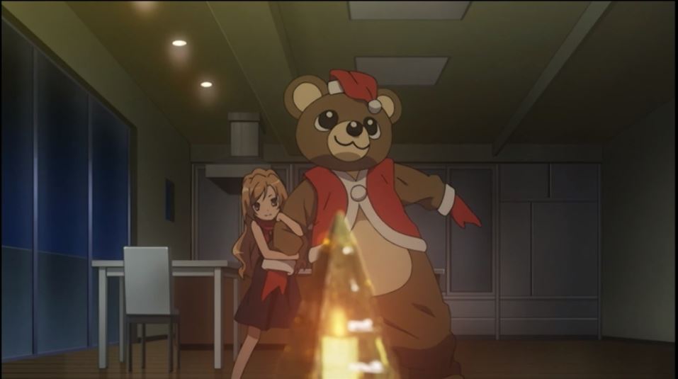 In all of this, however, some acts of selflessness stand out to me the most. Despite knowing he’s hurting his chances with Minori, Ryuuji leaves the Christmas Party. Why? To try and cheer Taiga up. He trades his expensive suit for a Santa bear costume and turns up at her apartment. He had no way of knowing that Taiga had just been sitting alone, sad that she was yet again on her own for Christmas. His turning up takes her sorrow and turns it into joy. She is so excited, showing off her little glass tree and laughing enthusiastically. She reveals after that she knows it’s just Ryuuji, not Santa, but she doesn’t care – it makes her happy all the same. After that, Taiga insists on sending Ryuuji back to meet Minorin. This all despite her obviously not wanting to be alone again. She was more concerned with his happiness (which she felt rested on getting together with Minorin) at that time. Minorin then rejects Ryuuji after seeing Taiga so broken over the idea of losing him. In all of these cases, the characters put someone else first, despite it being at their own expense.Taiga shows "santa" (Ryuuji) her tree.