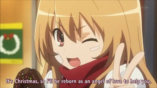 ToraDora, rather than getting one Christmas episode, gets 3. In my opinion, these 3 episodes are some of the most emotionally riveting episodes. From Yusaku’s confession revealing to Taiga that he likes Sumire, to Taiga’s heart wrenching realization of her feelings for Ryuuji, to Minori’s rejection of Ryuuji. Romance isn’t going well on any front, for anyone. Why? In part, because everyone is too busy putting everyone else first. Ryuuji wants Taiga to be happy, so he continues to try and set her up with Yusaku. Taiga wants Ryuuji to be happy, so she promises to play cupid for him and Minori. Ami even warns Ryuuji in her own way, because she’s worried that hearts will be broken. Minori rejects Ryuuji in large part because she realized Taiga’s feelings for him.Taiga promises Ryuuji she'll be his angel of love for Minorin.