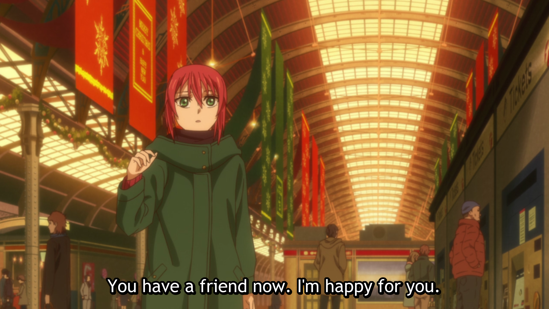 Alice and Chise speak on the fact that being in the world of magic can be lonely. They exchange the fact that they don’t have a lot of people to give gifts to during the season and that makes them self-conscious about their social lives. Still, they share a meal together in the heart of London because they are able to celebrate a season that brings people together.