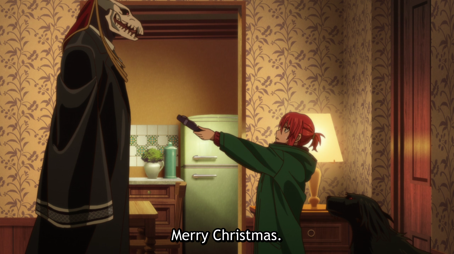 There is a beautiful scene where Alice is binding the wounds of her master who jumped between her and a demon creature to save her. I believe that one of the deepest connections a person can have for another is that of protection and trust. Alice has a bond with her master where they protect each other, a parent-child relationship. Alice and Chise build their relationship on trust seen by how they share their inner struggles with one another. Christmas isn’t just about having joy with one another, it’s finding healing through emotional connection.