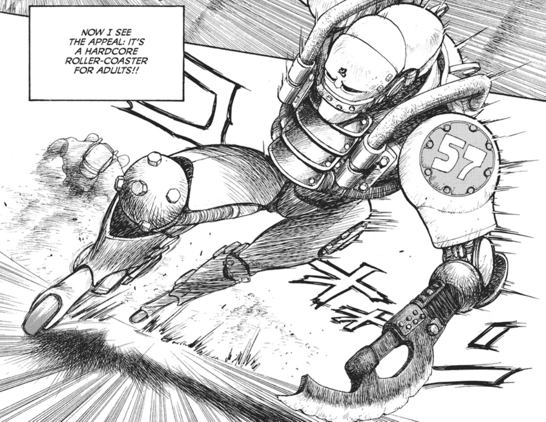 This is what I’ve been waiting for. Volume three of Battle Angel Alita transfers the action from the streets of the Scrapyard to the famed world of Motorball, a psychedelic, cybernetic version of roller derby, where broken bones are traded for obliterated limbs, and concussions for splattered brains.