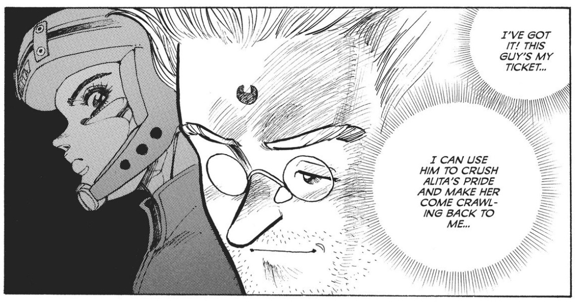I should clarify here that Ido doesn’t want Alita literally crushed, as is common in the world in which they live. He simply wants her to suffer defeat, which in Ido’s brilliant mind (I guess all of us become dumb in matters of the heart) will bring her back to her senses—and to him. Alita had seen Ido during a race, but ignored him, which furthered developed within the doctor a feeling of rage and bitterness, while also building in him a sense of jealousy. Alita, meanwhile, feels some of the same emotions when she sees not only that Ido has sided with her new rival, but that he’s become close to Jashugan’s sister, an attractive young woman of Alita’s age to whom she has a disdain (and visa-versa).