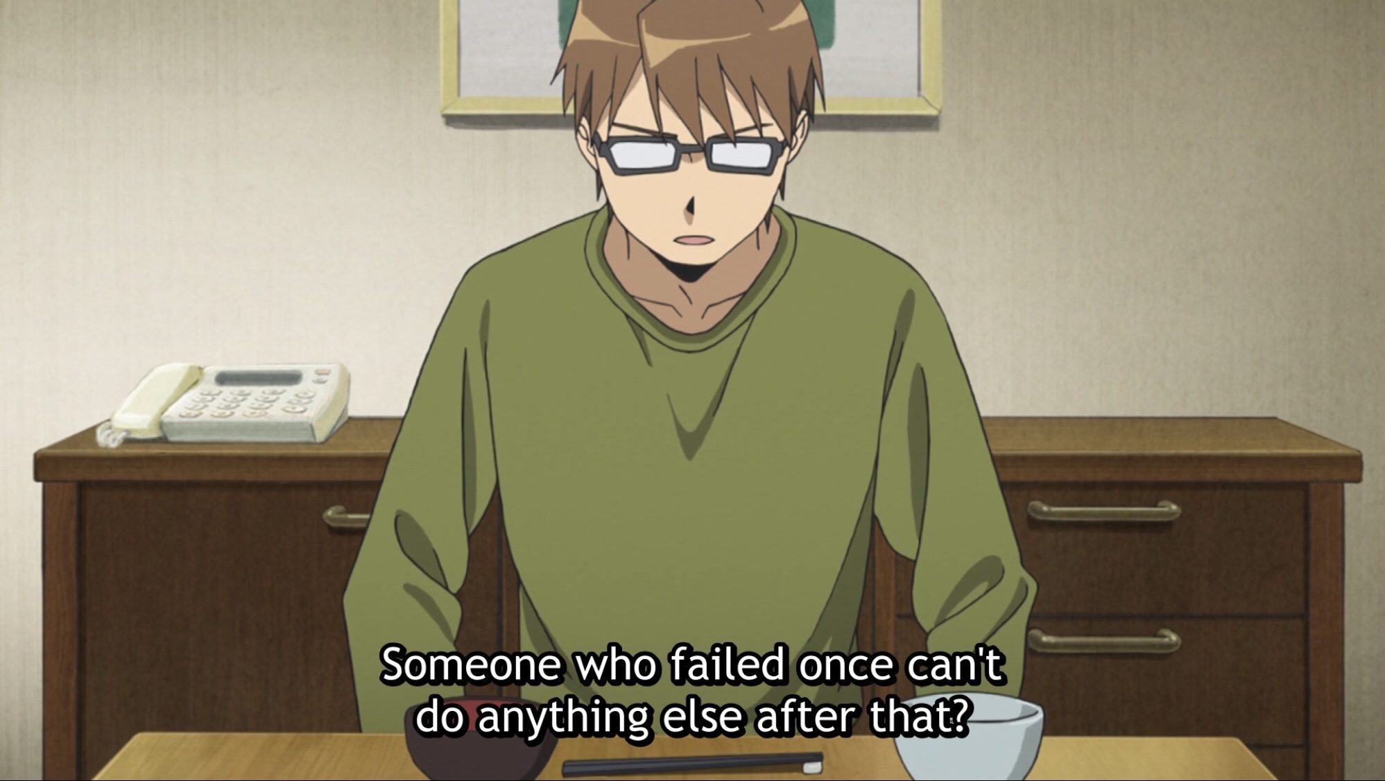 But in season two of the series, in the final episode, Hachiken says it again and this time, not to humorous effect. He has returned home for a quick visit, making the trip only to pick up study notes to help his friend and love interest, Mikage. Hoping to sneak in and out quickly, he’s forced instead to stay for a family dinner. For most of us, the occasion would be happy or at least tolerable, but for Hachiken, who loathes his father, it’s a test of patience, to exhibit the growth he’s experienced as a high school freshman in the face of his dad’s unrelenting coldness and uncompromising expectations. It’s challenging for Hachiken, who wilted while studying for high school entrance exams under his father’s repression, and doesn’t experience an ounce of love or compassion from him.