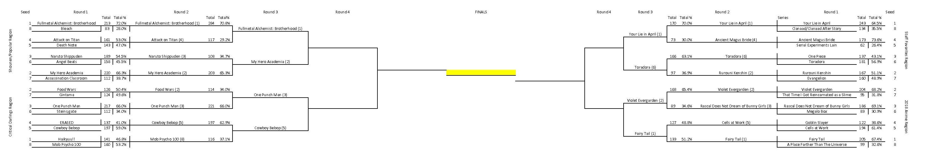 - Violet Evergarden has probably had the easiest route so far, though they meet a powerhouse in Fairy Tail this week. If it makes the semifinals, I would say that either that anime or One Punch Man has had it easiest. FMAB has had the hardest route, though you wouldn’t be able to tell by how thoroughly its trashed the competition.