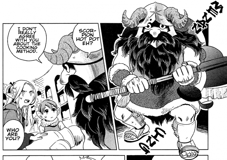 At this point they are joined by Senshi, a reclusive and eccentric dwarf with a passion for monster cuisine. Noticing Laios’s amateurish attempts, Senshi offers his own cookware and expertise, revealing that he himself has been eating the monsters of the dungeon for more than ten years! With his assistance (and after surviving a surprise attack from a ceiling-dwelling slime), they prepare the dish of the day: huge scorpion and walking mushroom hot pot.