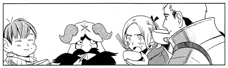 So the situation’s grim, but the dark tone is leavened by the charm and the sweet good humor of the cast. Many a seinen series (and much modern fiction) thrusts the reader into a nasty world full of equally nasty people, with no clear heroes and nobody worth rooting for. In Dungeon Meshi, Ryoko Kui has given us one of the most lovable adventuring parties in manga. Laios is the clear-eyed, high-hearted, naive idealist, all smiles and boyish enthusiasm, a pillar of strength and quick wits in a pinch, maddeningly inept at reading people and social situations; in short, a paladin, and a true hero. Marcille is the scholar (and sometimes the schoolgirl), elegant yet practical, at turns bashful and fierce, frequently the voice of reason, occasionally the font of madness, sometimes vain, always courageous, and probably the most dangerous of the bunch. Chilchuck is the straight man, the dad, the long-suffering professional beset by incompetents, a man who understands the value of things, not least his own skills, and is frequently pained by the churlish carelessness of his bumbling companions. Senshi is the sage, the wise fool, the half-wild hermit, a beautiful, burly bear of a man, firmly rooted in the earth, almost an elemental spirit of the dungeon itself – and deeply caring.