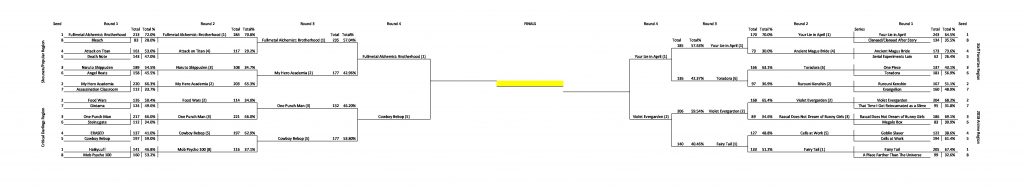 Our regional finals concluded last week, and for the most part, the matches were never in doubt. Three-time defending champ, Fullmetal Alchemist: Brotherhood, defeated last year’s runner-up, My Hero Academia, with some 57% of the vote. It was much closer than FMAB’s previous matches, in which the series garnered 70% or more of the vote, but that’s still a big win against possibly the second-strongest competitor in the tournament. Your Lie in April defeated Toradora and Violet Evergarden took down Fairy Tail by very similar margins, ensuring that we’ll be reminded of tearful goodbyes in the semifinals.