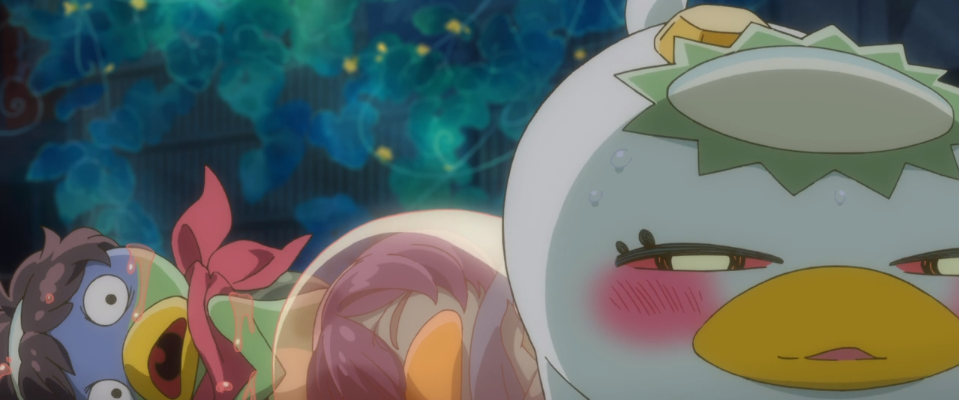 Two boys that are wildly different end up connected as…kappas? Sarazanmai opens with Kazuki telling about the important parts of his day – texting a girl, carrying a box, and watching the daily fortunes. We then see Toi, who is robbing a “Kappazon” car. The two get into a scuffle and destroy the statue of a Kappa King. What happens later is a whirlwind of weird where the Kappa King removes a fake anal organ which transforms these two enemies into kappas together. When the Kazuki’s friend Enta finds them, this fake organ is removed from him too. The fake organ stores human desire and is transported in…Kappazon boxes to some central location. They have to fight kappa zombies in order to eventually be returned to normal. Also, there’s a song and dance number in the middle of the episode, where the newly transfromed kappas use the power of music and dancing to defeat a kappa zombie and reveal their secret…shames? Including the secret that Kazuki also takes selfies as a cross-dressing idol. The episode ends with us finding out the reason behind Kazuki’s cross-dressing and them apparently returned to human form…for now.