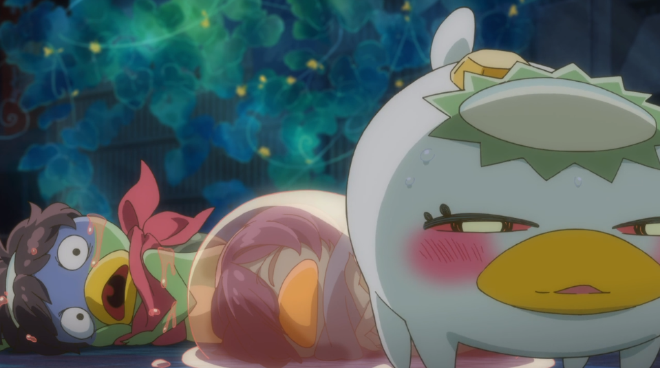 Sarazanmai is a weird show steeped in…pseudo-mythology and over the top ridiculousness. The series is from director Kunihiko Ikuhara, who also served as director for the Revolutionary Girl Utena series and film. There are a lot of butt references and…butt based attacks. It gets gross at times as they enter a monster’s anus to remove it’s power, restoring their humanity temporarily from the butt of a monster. No, I’m not kidding. I have no idea if I’ll keep watching this show and I have no idea how it is going to treat it’s main cast from what I saw in this episode.