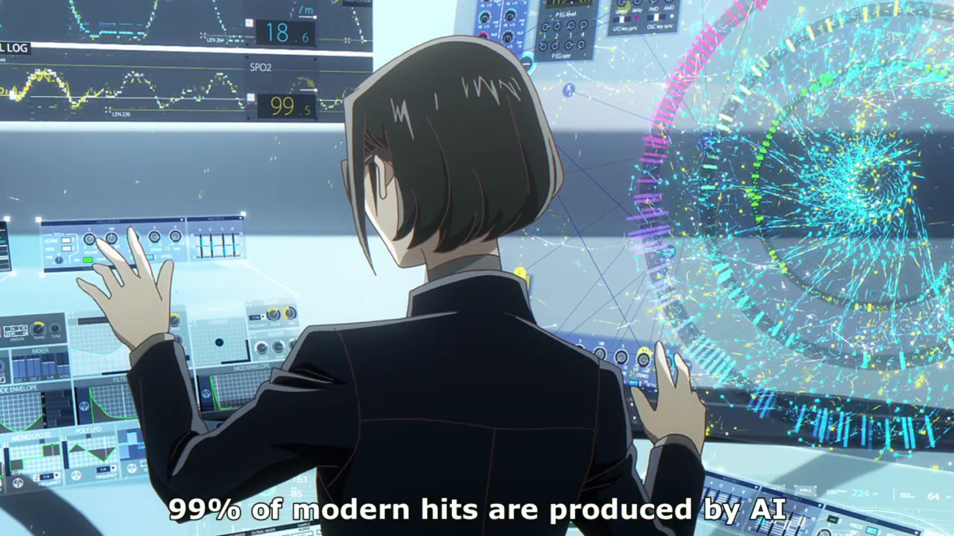 Meanwhile, a third character is also born to turn—but it’s not to Gus, Angela, or Tao whom I refer. The third character is simply, people. Much as in Cowboy Bebop, the background characters are omnipresent in Carole & Tuesday; they are an important part of the design and action. In this episode, they respond to the video of the girls singing, and they are often in the way of or crowding around the main characters. They even figure prominently in the series OP, which we experience for the first time, infected by the lovely dancing by Carole and Tuesday, causing them to dance as well. And with Tao and Angela rising as villains of a sort, it becomes apparent that the main antagonist is a society that has exchanged passion and human art for automation. Tao declares that human warmth can be replicated through A.I., but Carole & Tuesday attempts to tell us otherwise, to explain that the human heart can do what a machine cannot, and that it will respond to the authentic differently than it will to the computer-generated.