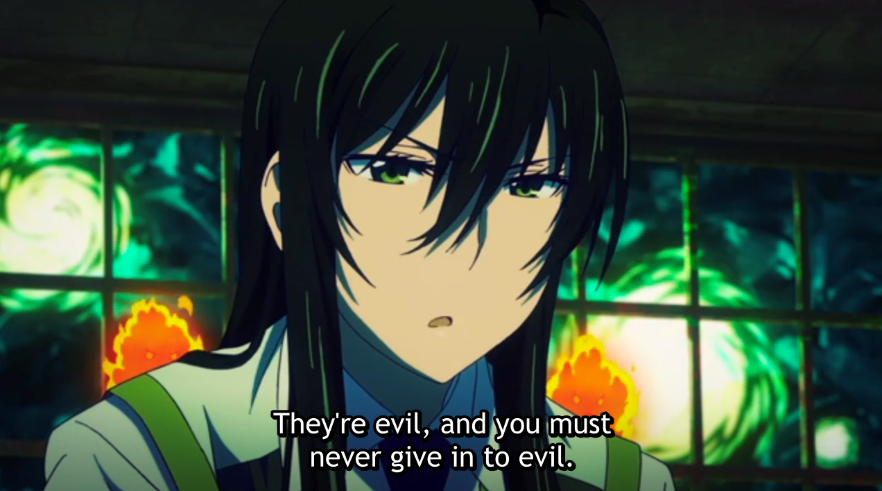 I can’t recall any instances where I “fled” in the capitulate-to-evil sense – evil witches have never been a problem in my life as they were in Takamiya’s case. But there have certainly been times where I “fled” from an opportunity to do good out. That’s part of what’s powerful about Kagari’s little speech: she doesn’t mean merely to resist evil herself, but to keep Takamiya from giving into to the temptation to run away. Whatever the enemy and whatever its objective, I suspect we all need Kagari’s exhortation that we must never give in to evil.
