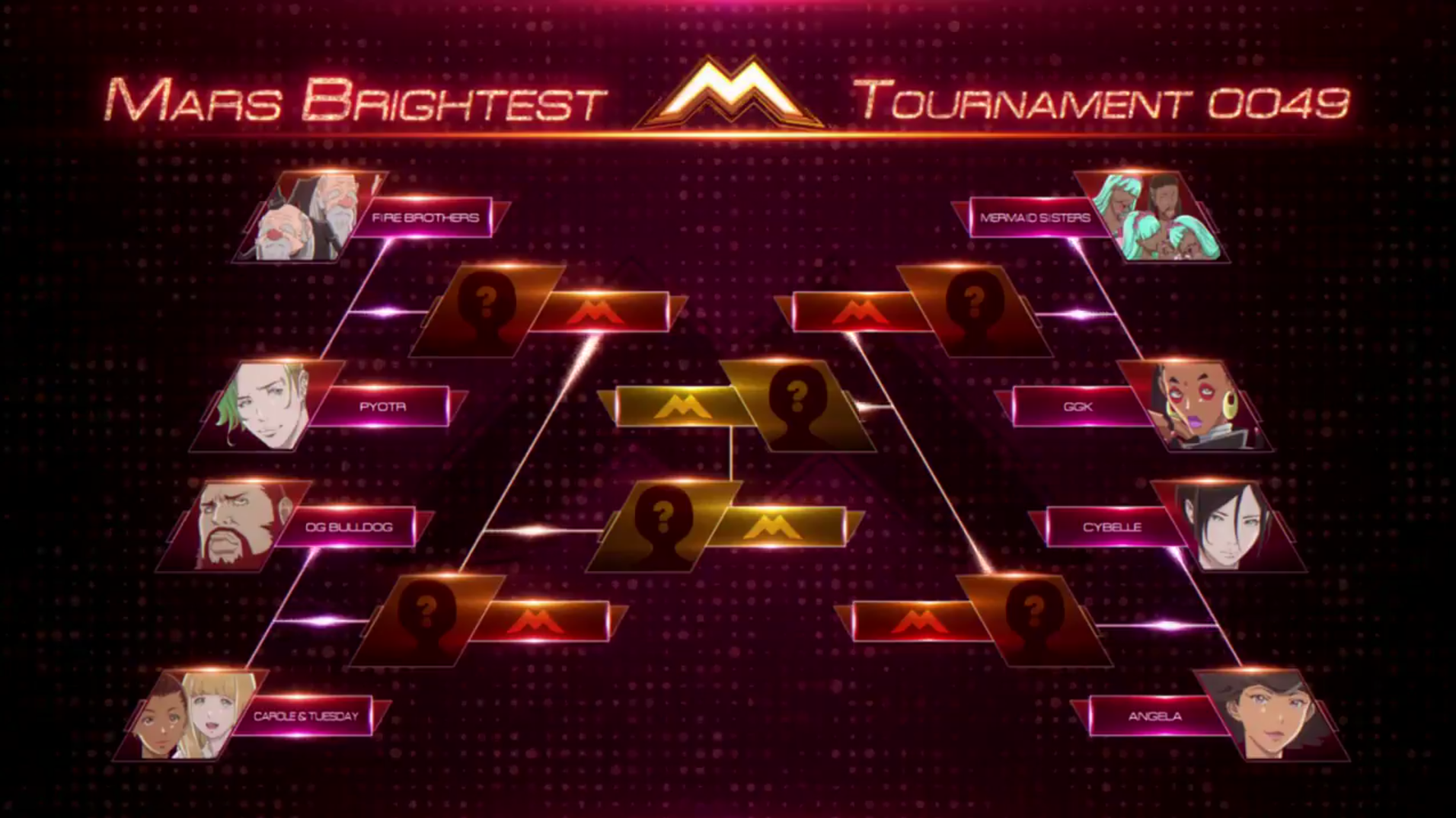 Mars Brightest is a convergence point—a mixture of styles, performance shows (1), and generations. On this stage, Carole and Tuesday perform in the first half of round one, going head to head against OG Bulldog, a large, intimidating man who stylizes himself as a killer, and who slays with an odd weapon of choice: operatic rap (2). His loss to the duo is no surprise (though the way he loses perhaps is), and neither is the loss by the Fire Brothers, 99-year-old twin rockers, to the young vlogger, Pyotr. The old is swept away for the young. Similarly, the stage seems to be set for the latter half of the round, where at least one young contestant will make it through (Angela’s “battle” will be against Tuesday’s obsessive fan, Cybelle).