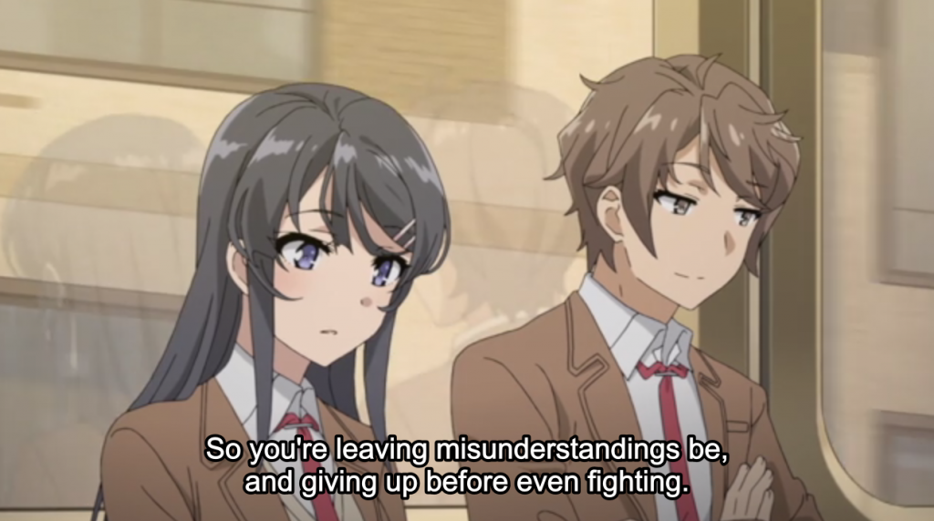 When Sakuta ruefully wishes, “I wish my class could hear that line,” Mai pushes back. “If it’s wrong,then you need to tell them such,” she says. Sakuta is provoked into a monologue about the futility of defending himself: