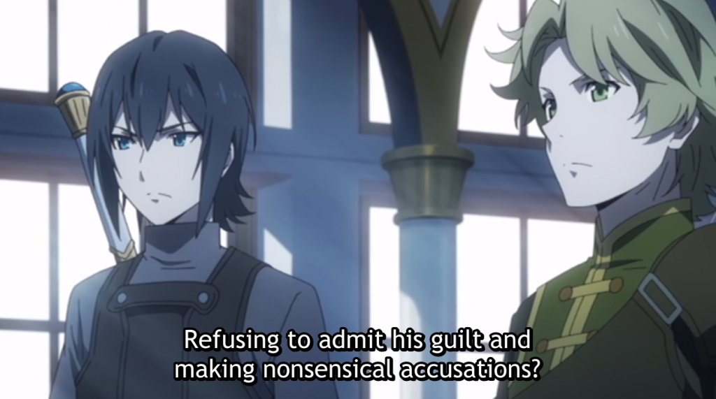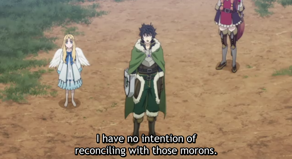 Naofumi did in fact defend himself and deny the accusations against him back in the first episode. Attacked with a false charge of attempted rape, he insisted he’d gone right to bed after supper the previous night. He denounced the accusations as “not even the least bit true.” He called the situation a setup. That said, following this initial defense, he makes no effort to repair his reputation. In fairness to Naofumi, he has little reason to try, since his fellow heroes responded to his defense dismissively. While his lack of concern over his own reputation is in some ways admirable, Naofumi loses sight of the fact that there is a greater good to be served through defending the truth.