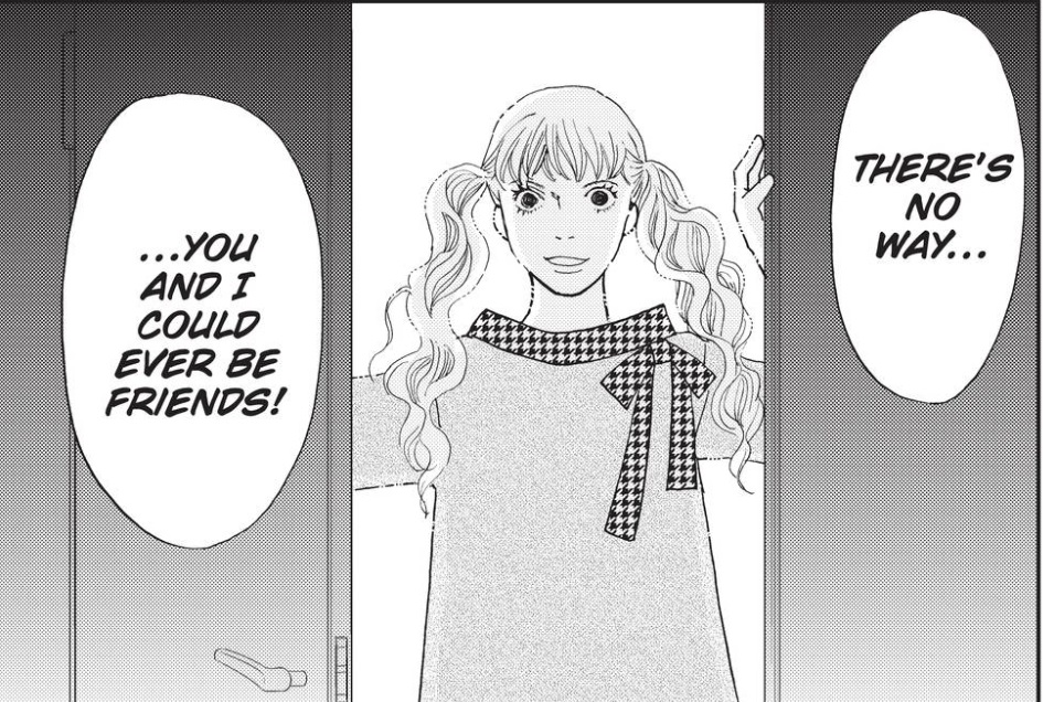 Later in the story, a new girl named Sakurako Sanjo arrives at school. From day one, Sanjo lies to Makino to convince her she is a pure friend. In actuality, she is an unknown enemy. When out one night, Sanjo slips a date rape drug into Makino’s drink. While Makino is intoxicated by the drugs, Sanjo takes photographs of her in various states of undress all while she appears to be sexually intimate with a boy named Thomas. Makino’s agency is stolen and sexual violence is once more brought to her. However, Makino once again displays a grace that should be required of no one. She forgives them.