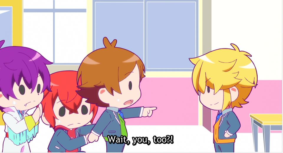 Urata is one of those fabled “high school transfer students” and wants to make a big impression on his first day at his new school. But he winds up getting upstaged by not one, nor two, but three other transfer students: the laid back Sakata, the flamboyant Shima and the cool and collected Senra. And that’s it, that’s really all there is—this episode clocks in at four minutes, opening included.