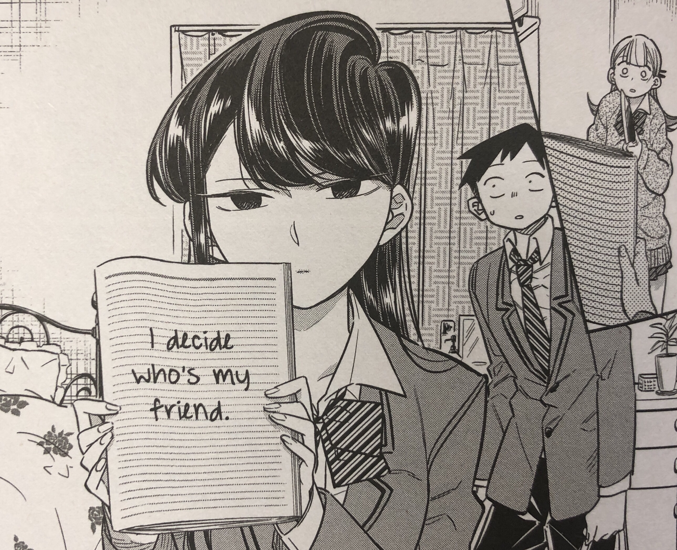 Slowly, and aided by her new friends (especially Tadano, the first one she made), school “goddess” Komi is starting to overcome her anxiety at talking to others and is headed toward her goal of making 100 friends. But one’s fears don’t disappear so easily; it’s still not easy for Komi to speak up, so how will she handle giving her order at a ramen shop, getting her hair done at beauty parlor, trying out clothes at the mall, and perhaps most challenging of all, inviting friends to see her room?