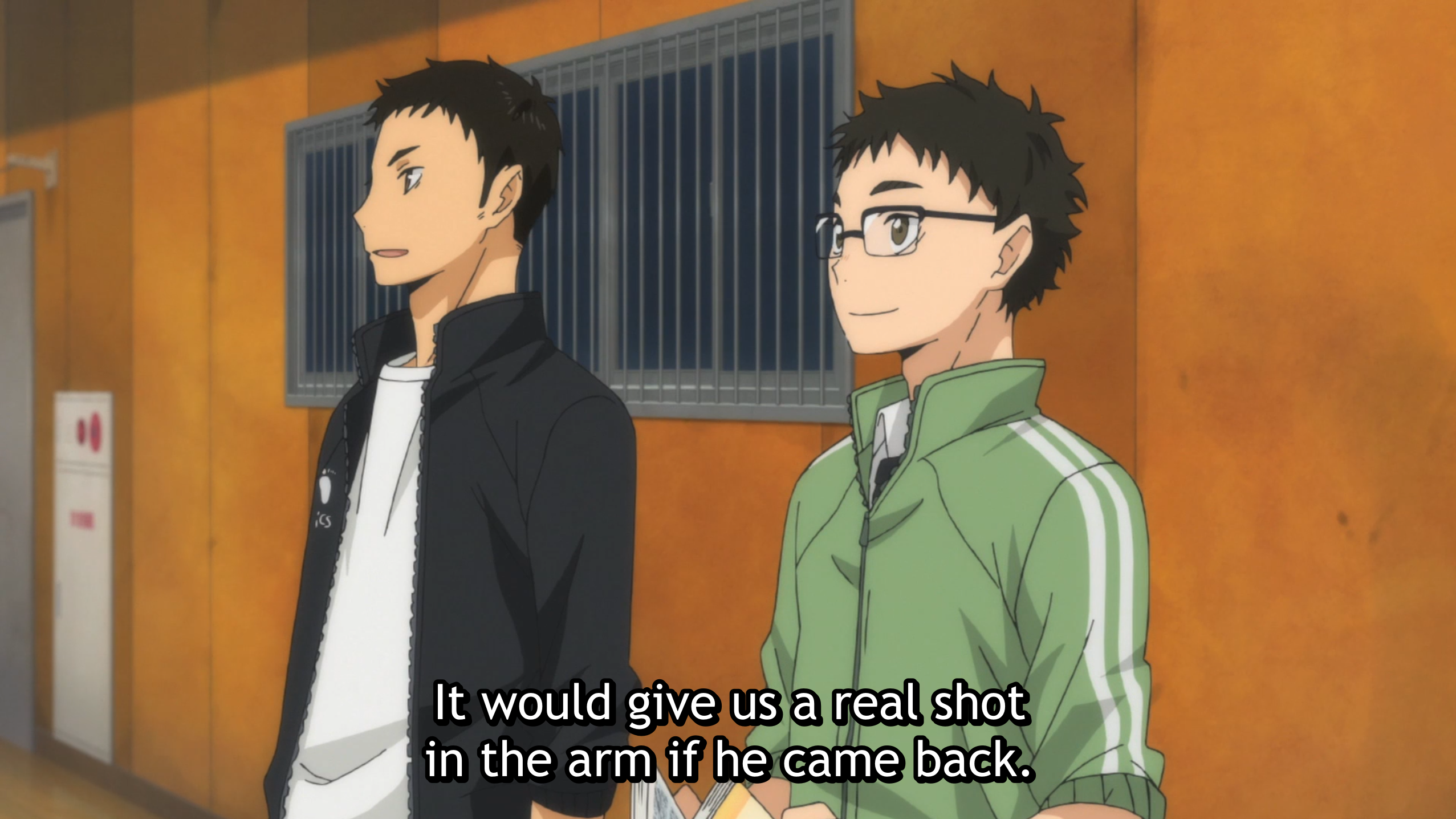 Asahi is as blind as I am. For him to grow, he must be with the team—he can’t become stronger apart from it. And meanwhile, the team counts on him as well. Like the church giving and receiving grace, setter and guardian are hurting without Asahi there, and the team is incomplete without their ace. When he returns—it’s then that Karasuno finally has a full team.