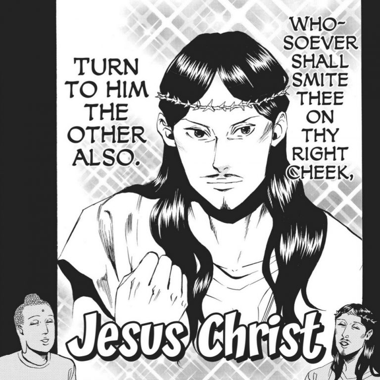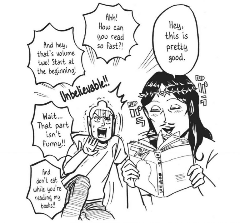 The first chapter of the manga jumps into an everyday life of Jesus and Buddha just hanging out in modern Japan. They go shopping, they hang out at home, they read manga—you know, normal holy person stuff. As the first volume progresses, it’s revealed that Buddha and Jesus had asked God* to let them vacation on Earth in Japan. They were interested in Japanese culture and in getting some well deserved R&R after working so hard for humanity.