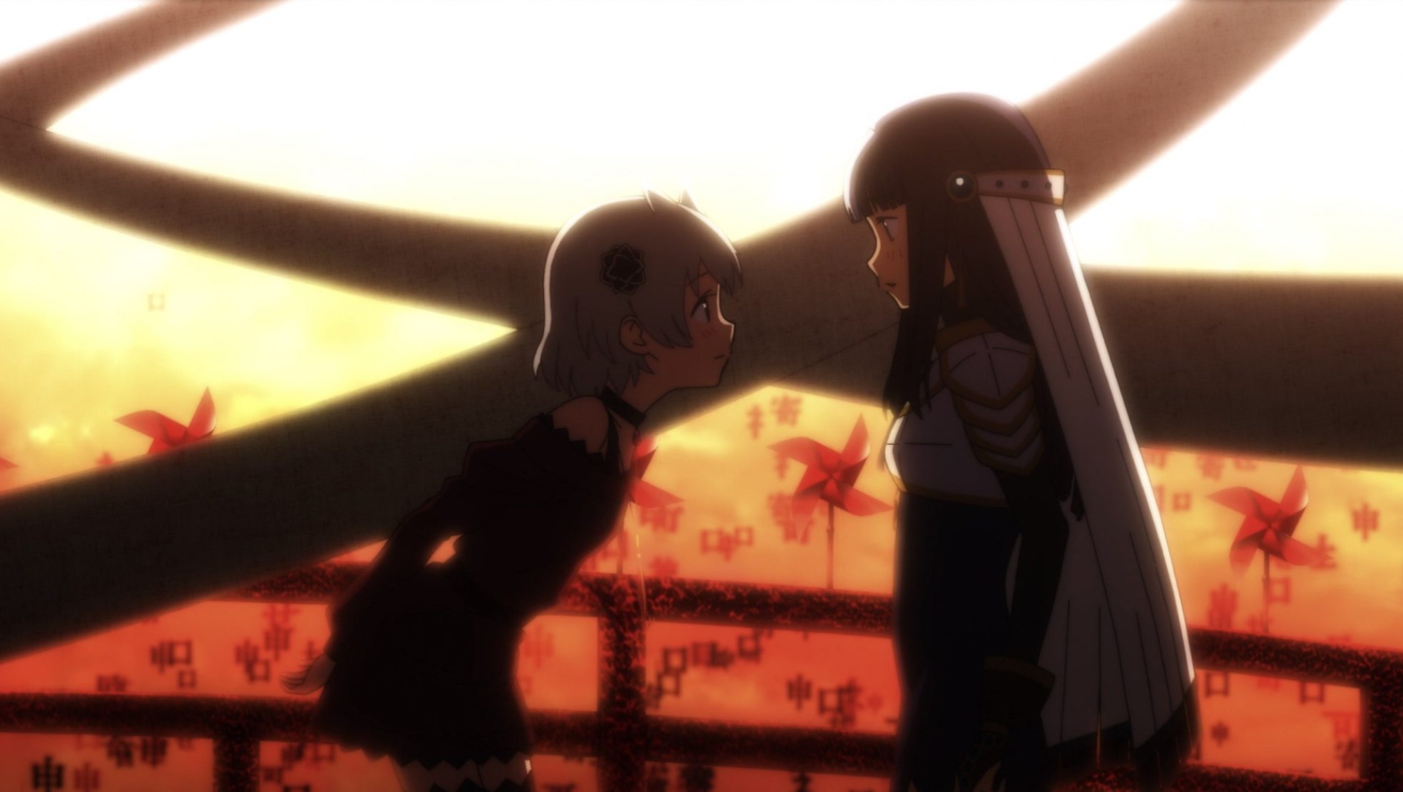 The remainder of the episode brings the action down, but the questions have now been established (or established further): Are the rumors that brought Mami to the city true? What is this creature that erupted from Iroha, and why did it come out? At first, since it arose after Iroha dreamed of Ui, I thought the new being might be what became of her little sister, but the after-credits scene shows a similar demon replicant of Kaede in her own team’s battle. What is causing this transformation? Is it a way to combat the increasing threat? And is Yachiyo part of this threat, as Mami seems to infer when warning Yui?