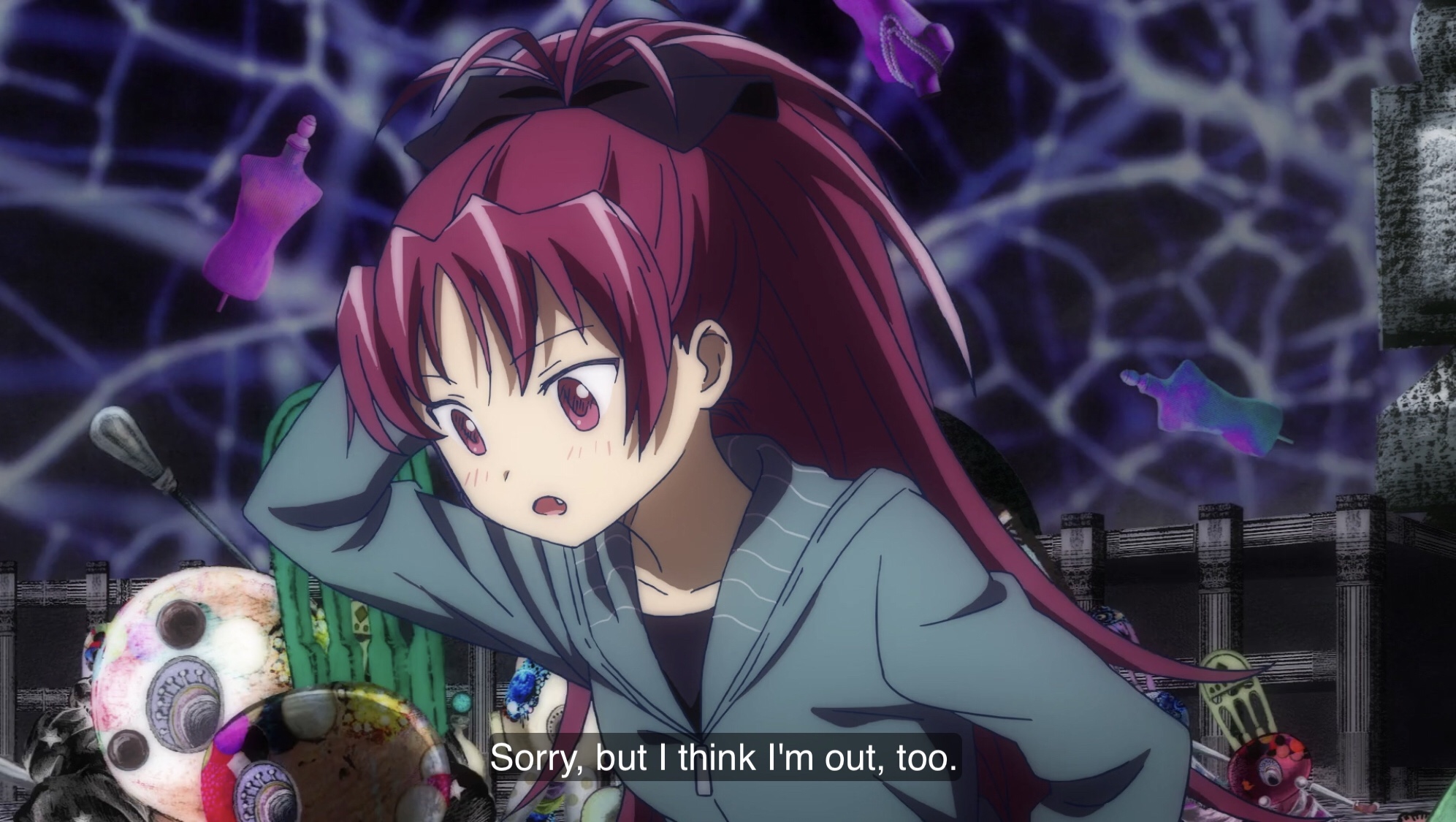 That last event is a surprising one; they employ the witches when Yachiyo and the others come into their lair, but the strategy backfires. Felicia, of course, hates witches and so flees from the Magius’ side. Kyoko doesn’t like the smell of this either, and also fights back, giving Iroha an opportunity to match up against the Uwasa. Harnessing her newfound power (and protected by her last few lucky chances from the Owl Water), Iroha is able to defeat it on her own.