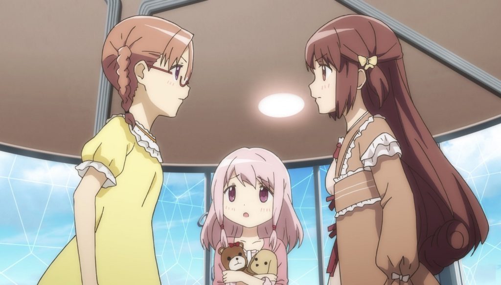 There’s not a lot of physical action in the episode—the team, and particularly Yachiyo, make quick work of the witch Tsukuyo sics on her. Instead, this episode of Magia Record is more about deepening mysteries. I think we’re at the tipping point now as the rest of the series should unravel all the mysteries, those mentioned earlier and others emphasized in this episode, including who the magius are, who Sana Futaba (the electric wave girl) is, and what happened to Ui and her friends. In this episode, we get a quick flashback showing Ui and her two friends, but strangely enough, four girls are mentioned in the scene—Who is the fourth? And what happened to them? Was is a tragedy, and is that connected to Ui’s disappearance?