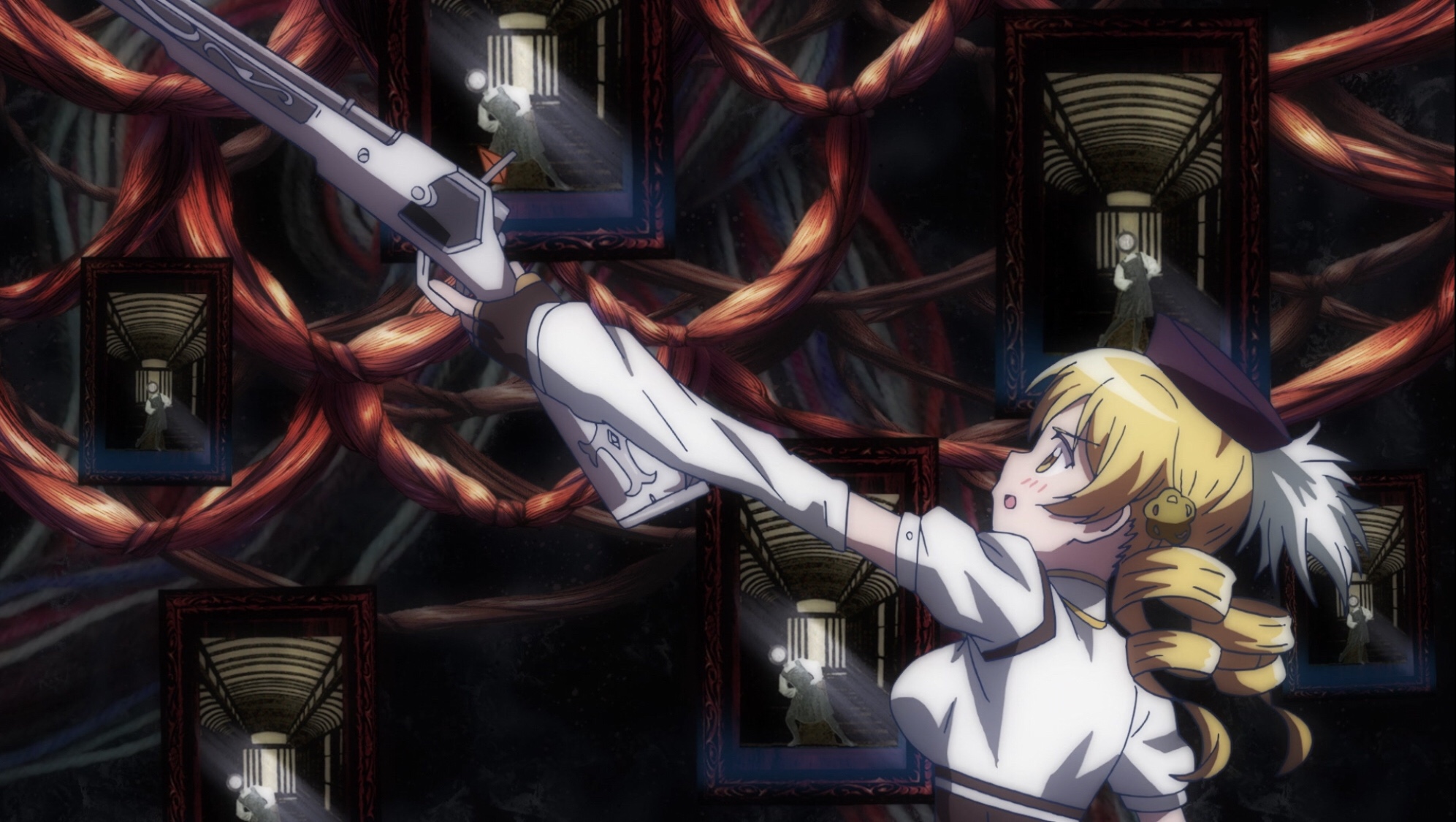 As the episodes progress, little surprises are dropped each week, but I was not anticipating the one in episode ten. With Alina waiting outside of the Endless Solitude for Iroha and Sana, and having released a witch to contend with both those two girls and the rest of the group, a savior arrives: Mami, whose gun play disrupts the battle. But here we find out a most unusual piece of information: Mami is with the Wings of the Magius.
