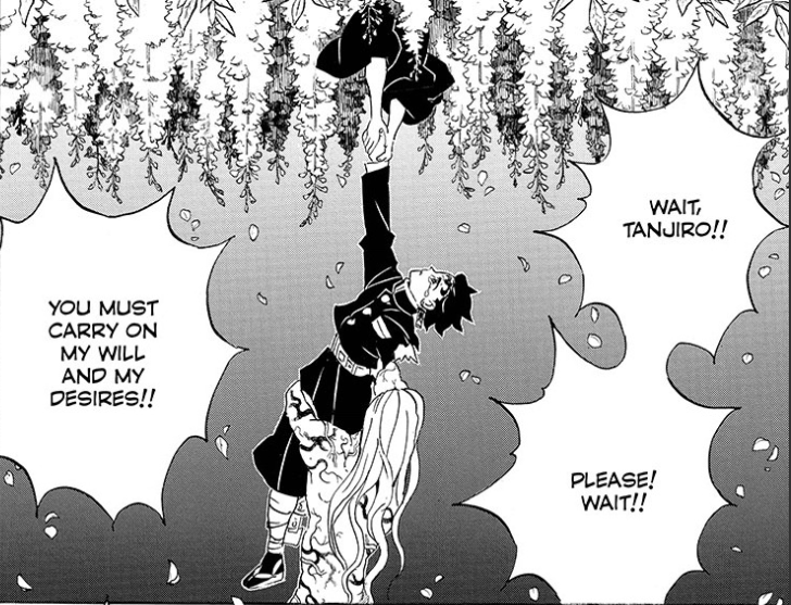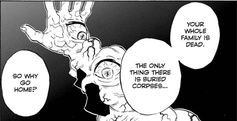 Muzan, sensing this, uses other methods. He is one of the strongest Satan figures in all anime, and this perhaps comes through best in chapter 203; as the devil tempted Christ in the desert, Muzan does the same to Tanjirou, and in similar ways. The devil offered to meet Christ’s physical needs, and Muzan does the same by telling Tanjirou he can live forever, instead of a mere few years more. Satan attempts to pull out the same sense of pride that led to his own fall, and Muzan aims squarely at his victim’s pride, as well, by explaining to him that he will become something greater than any living being that has ever previously existed. And in his final temptation, the devil twists something good by misusing scripture; Muzan takes the love of Tanjirou’s friends, something likewise good, and tries to make him feel guilt over it.
