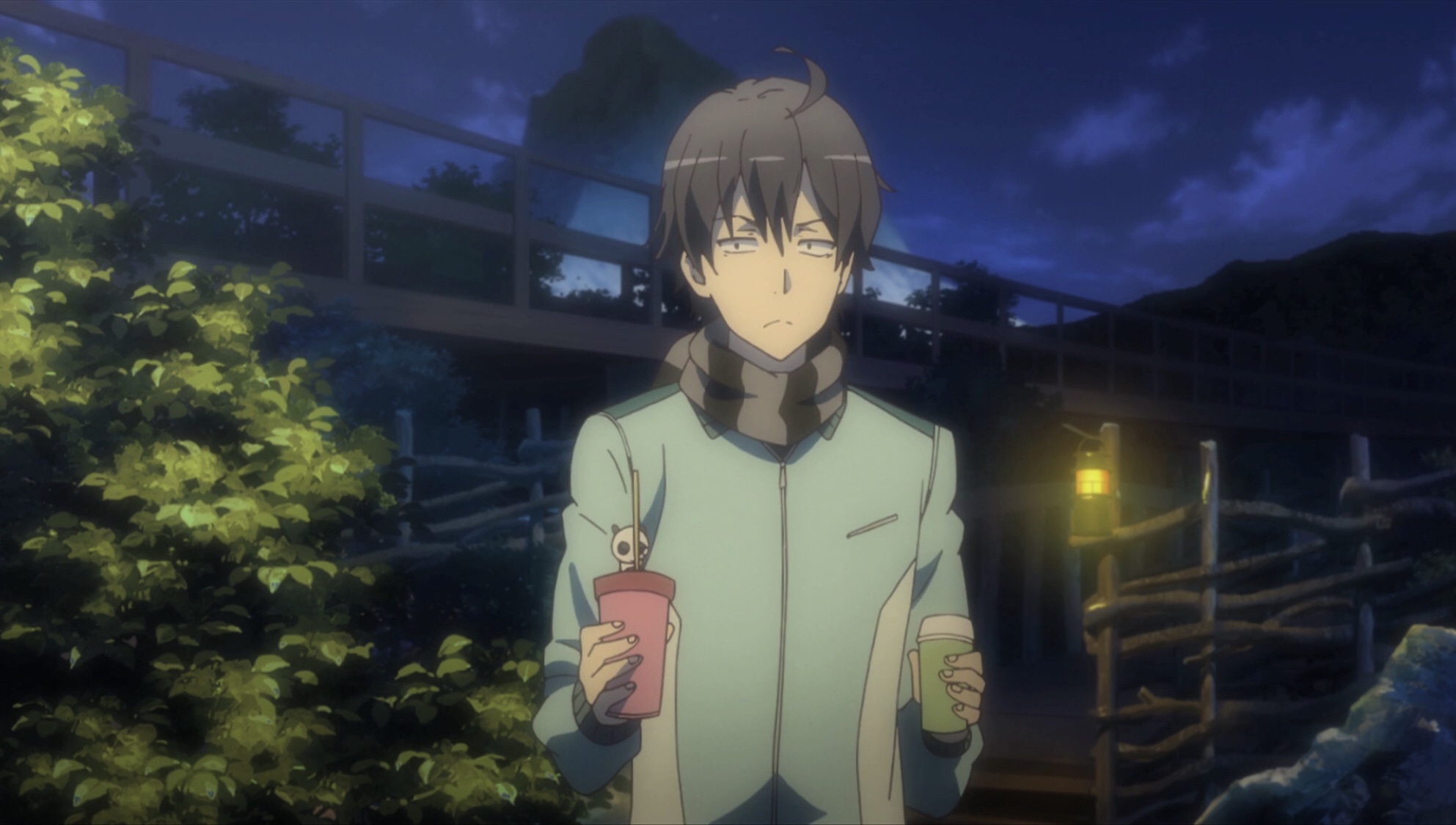 After their conversation, including Yukinon’s explanation about moving home (and Yui’s volunteering to help her pack), Haruno walks to a convenience store with Hiki, the two chatting about adulthood and drunkenness. Haruno insists she’s not inebriated—and judging by how serious she becomes when talking to Yukinon, she’s indeed probably just buzzed—and theorizes that she may not be able to get drunk; she then whispesr to Hiki that he’s probably the same, creating an analogy insinuating that both of them find it difficult to ever be themselves, free like a drunk person, without inhibition.