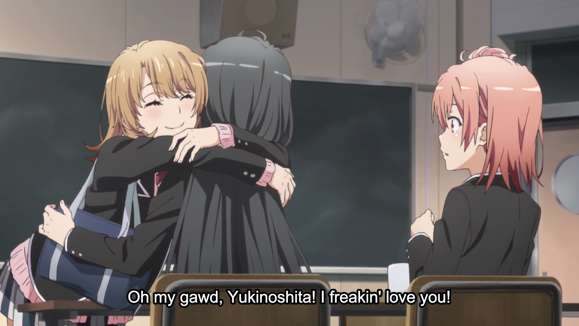 But it’s so much more than that. The existence of that photo also reveals how much Hiki means to Yukinon. It’s a punch in the gut, for it’s Yui that spends time with her, eats lunch with her, visits her home, and helps her pack, but it’s Hiki that changes Yukinon. There’s a special relationship there, one that Yui doesn’t have with either.