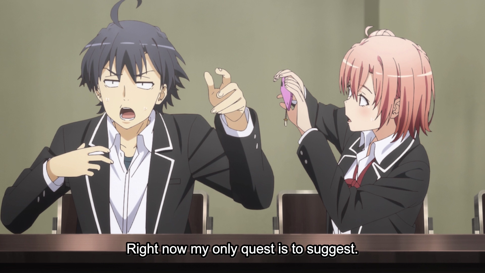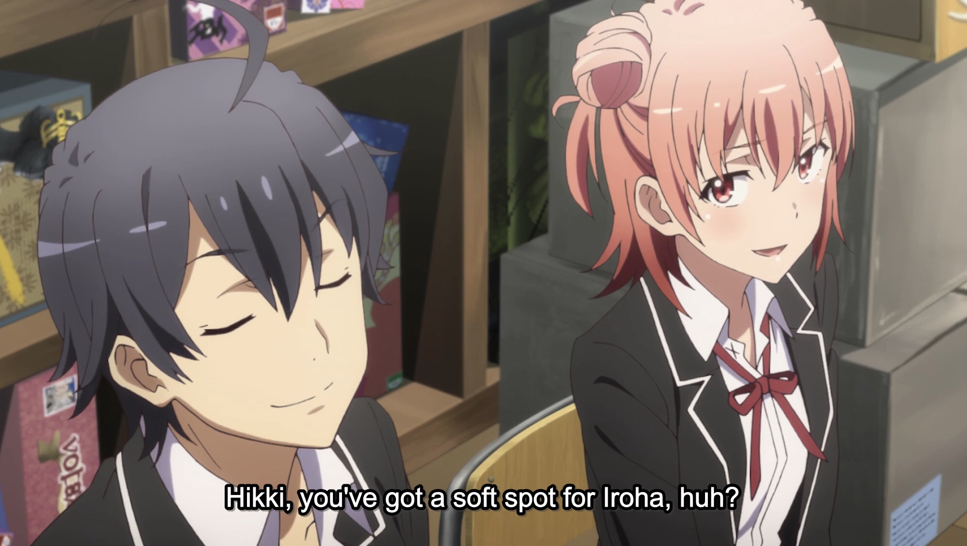 We get a little break from all the heaviness of season three with a mostly-carefree, funny episode of Oregairu. There are three major scenes in the episode, and they all involve Hikki and Yui trying to explain something to someone (or someones), to varying degrees of success, starting with the two members of the school’s Gaming Club (How does the Gaming Club have fewer members than the Service Club? That’s hilarious! [Note: You may see me fall into Orimoto mode during this episode, er, article]). Hikki tells his plan to them, but even though he’s grown a bunch, he still has trouble explaining his ideas and thought process, but Yui is there to help, and not just via her words; the cuteness which Hikki now accepts as a part of their friendship is very important in getting the two on board. I mean, can you blame them, especially Sagami, when the girl he sees most his is horrible (misunderstood?) sister?