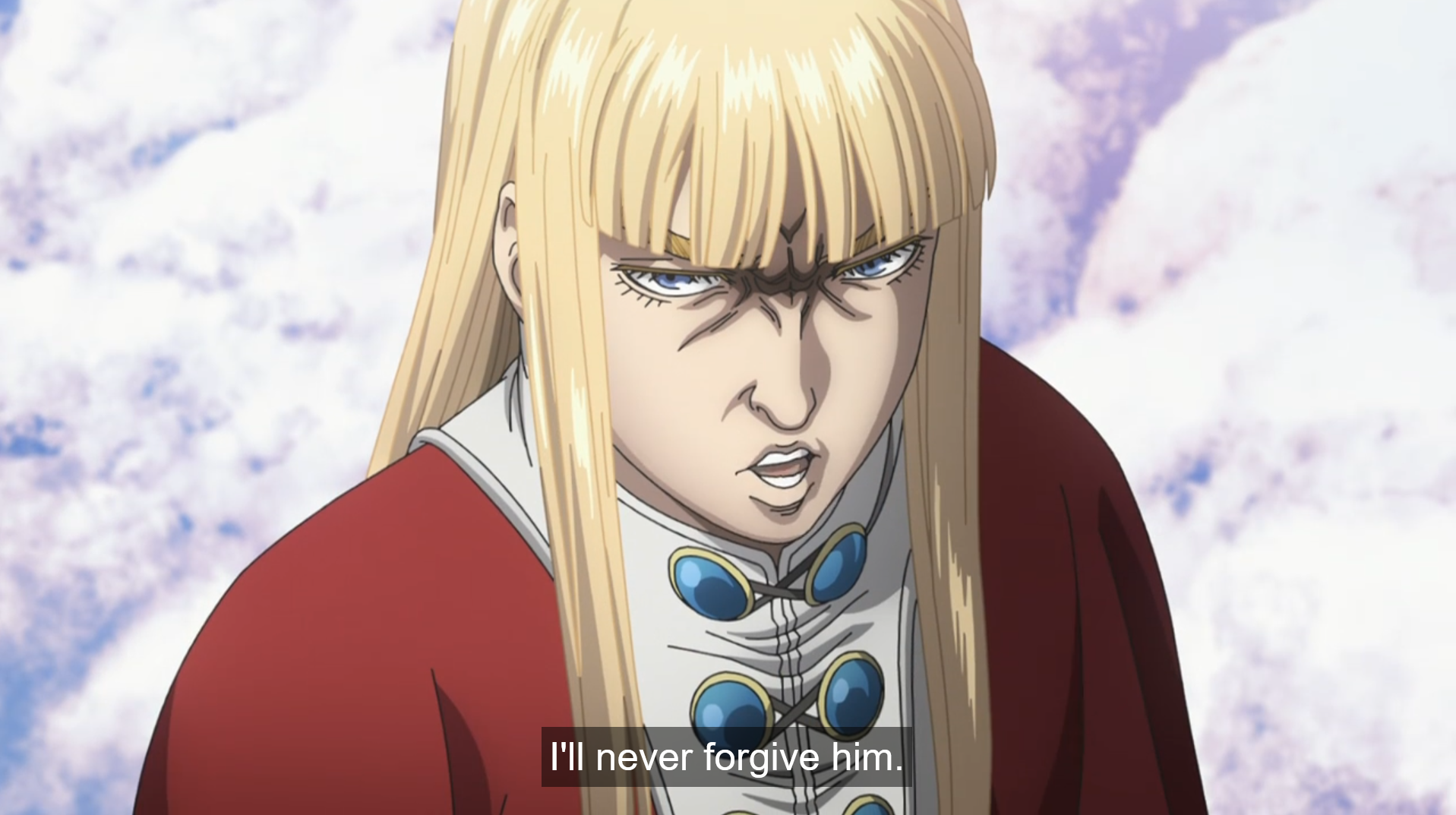 Canute stands as witness during the duel between Askeladd and Thorfinn (what would be their final one). By this point, the prince has overcome his timidity and is himself scheming to commit patricide and regicide both, empowered by Askeladd and Thorkell, who have become his retainers. The change of heart occurs as Canute, previously so devout, comes to a realization regarding fatherly love, and decides to rebel against God: