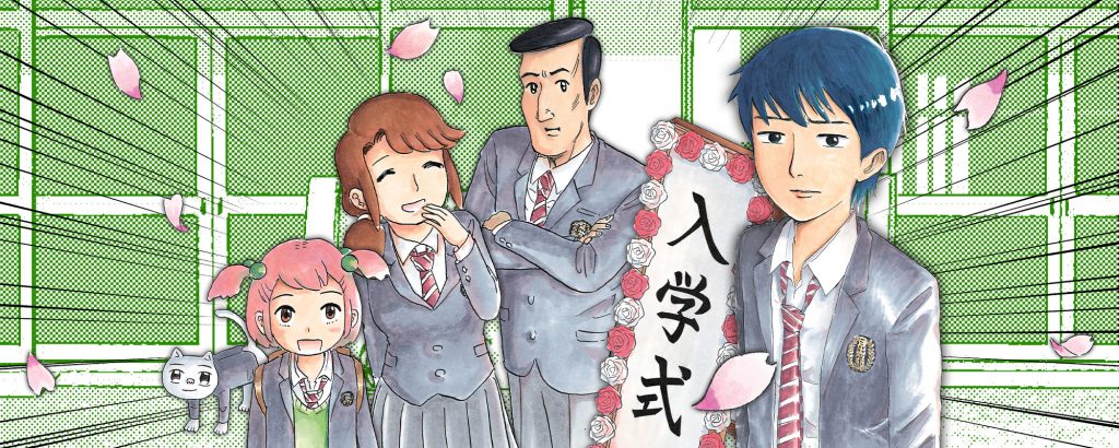 Kotaro’s father is also starting high school. The same high school. Then he turns around to see his 8 year old sister in a school uniform. And his Mom. And his cat.