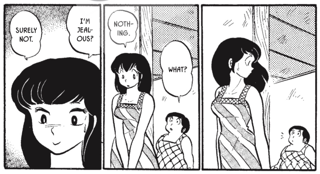 And it’s in that final regard where Maison Ikkoku excels, inside that weird space where it’s less about a surface-level “Does so-and-so like me? Do I like so-and-so?” and more about deeper concerns that prevent the two from properly establishing a relationship. Godai is no longer a high school student, and Kyoko is several years older than that, having lived a life already punctuated by major and even tragic life experiences. Though young in a worldly sense, the two are old by manga standards (especially today’s); it would be strange for the series to feature a naive tone that marks so many romantic comedies. Instead, Takahashi strikes a lovely balance between between silliness and misunderstandings that make you put your palm to your forehead and real barriers that are suitable for a story about adults. Without spoiling the volume, the reveal about Kyoko is the most significant of these obstacles; it’s also a brilliant move, because it pushes the character of Godai, who otherwise is still so immature that he comes across as not deserving Kyoko’s affection, a way to grow into that role.