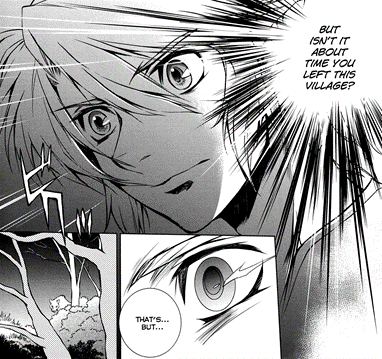 In the Twilight Princess manga, two of the village children venture into the dangerous, monster-infested woods surrounding Ordon, prompting a panicked, nighttime search. Feeling responsible for their disappearance, Link pursues but halts when he hears a god-like voice call out to him from a distance: “Isn’t it time you left the village?”