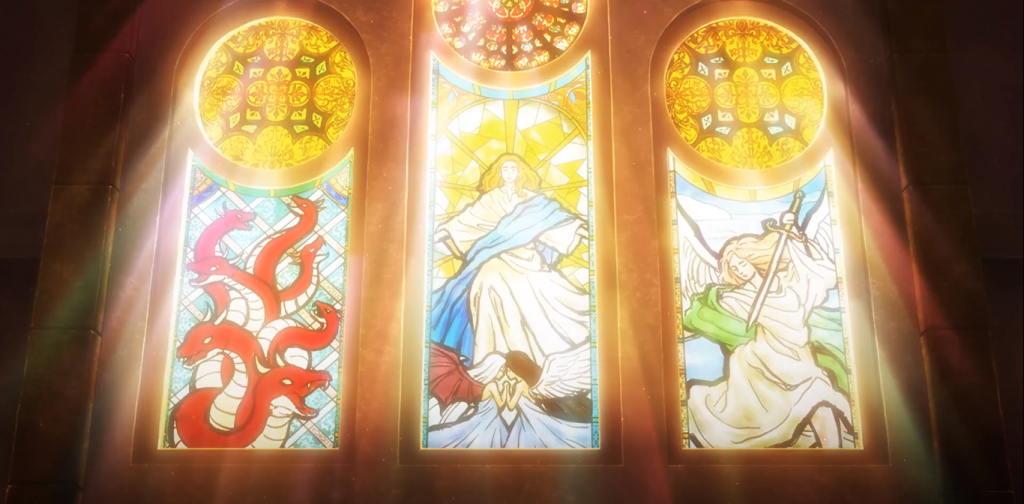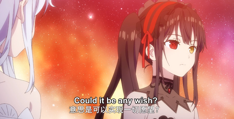 Without much of an introduction, Kurumi, the girl in the red dress, begins fighting Queen, the girl in white dress/military uniform in a pretty cool-looking church with vitrals. Our protagonist uses guns and a giant magic clock, Zaphkiel, while her rival uses a sword and her own magic clock, Lucifugus. It seems that the girl in white deems the world hers to destroy, and Kurumi opposes this. Acceleration, location swapping, impossible jumps and magic words are exchanged (“Aleph!”), and Queen wins with a final bullet to the eye, shaped like the sphere of a clock, which then starts turning backwards. And thus, Kurumi is sent to a high school where the heaven above her head is a multi-coloured galaxy, and other schoolgirls with different superpowers are going to begin fighting a battle royale. This is the afterlife, we are told, and they are Spirits or Quasi-Spirits, godlike entities and demigods. The winner will have a wish granted to her. And as it turns our, Queen is one of the participants, too.