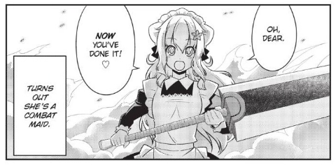 In fact, the comedic elements are a fundamental part of what’s making this manga a success, with Hata creating humor sometimes by subverting expectations, as when what seems to be a major villainess turns up at the couple’s door and Tsukasa just slams it on her, and also by continuing to press Tsukasa’s geeky nature. Otaku and pop culture aficionados will enjoy the continued references through this volume, which include Rumiko Takahashi , a Buster Chain (Fate/Grand Order), Rurouni Kenshin, Fate/stay night, Star Wars, Terminator, The Avengers, Nausicaa of the Valley of the Wind, and The Walking Dead. There’s even a majority of a page dedicated to discussion of Roland Emmerich’s directing career (let’s see another manga do that!).