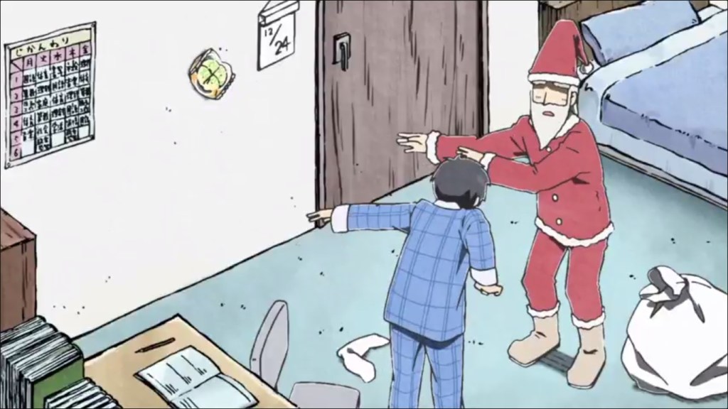 There are two Christmas sections in the middle of this crazy yet hopeful portrayal of our ordinary lives. Nano and the Professor discuss what will they ask from Santa as they prepare the decorations for their house. The Professor, in her spoiled style, wants everything she can think of. Nano, in her own way, wants some household accessories and an Ivan Bilibin book (I approve! His illustrations are amazing.). But the Professor gets mad: She has asked for a lot of things, so Nano can only ask for one present. This is so obviously unfair, and Nano is so utterly shocked, that the Professor tries to make amends, somehow. Cut to Helvetica Standard, where Santa disappoints a young boy by bringing him sweet melon bread as a present.