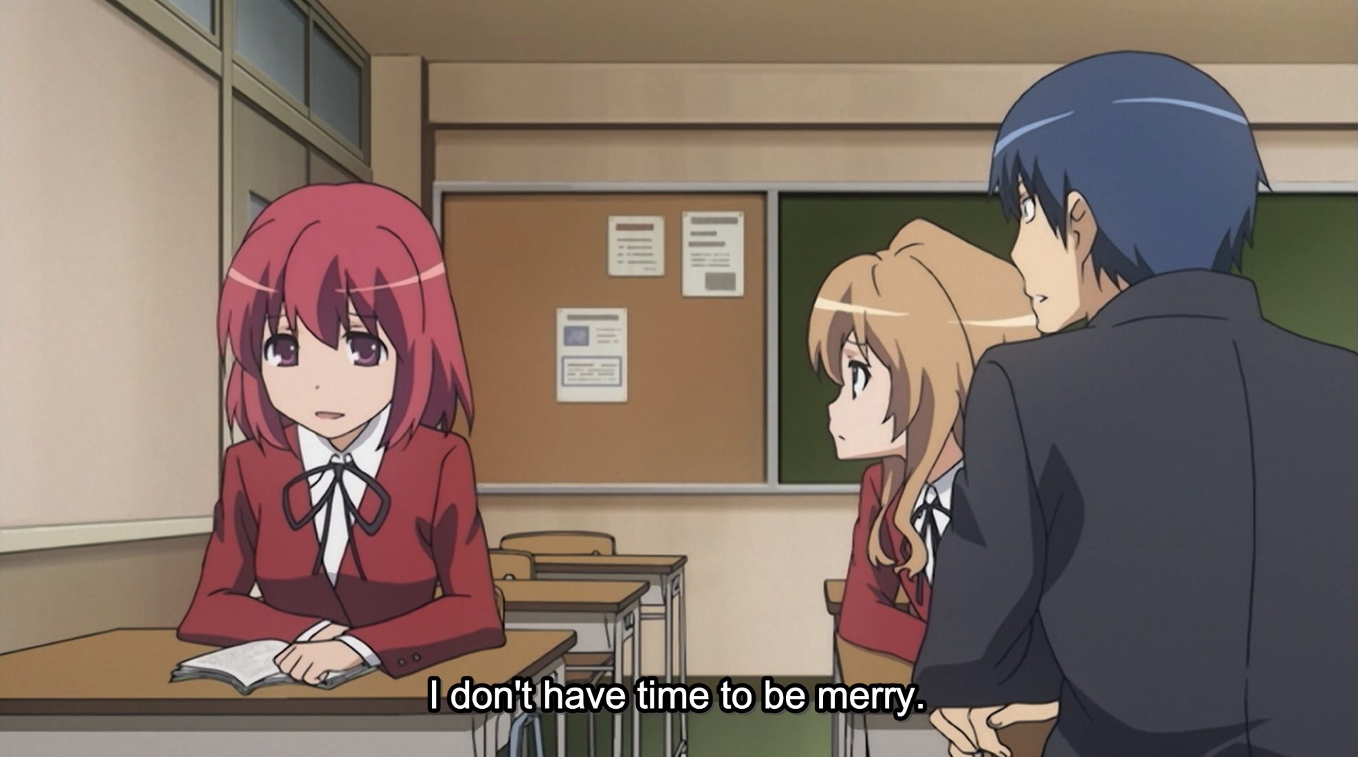 As teenagers, the cast of Toradora, even those as mature as Ami, desire that “high” of getting what they want. Although I’m older, I still live similarly. It feels immature, but I work hard to get money so that I can live in comfort. I purchase what I “need,” which are rather those things that I think will help me be happy. And like those teens trying to carve their own paths, Ryuuji toward Minori and Taiga toward Yusaku, I’m not on the path toward gaining what it is that will give me an enduring satisfaction.