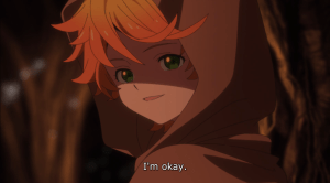 We begin where we left off in the previous episode, with Emma and Ray realizing their saviors are actually the demons they fear. In her panic and worry, Emma runs off to find the other kids, only to see that they really were safe and preparing dinner for everyone. The demons then properly introduce themselves as Mujika and Sonju, hermits whose religion doesn’t allow them to eat humans. This fact and the others’ assurance of their character allows Emma and Ray to enjoy a peaceful meal with everyone.