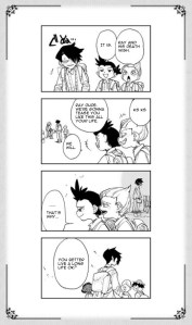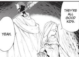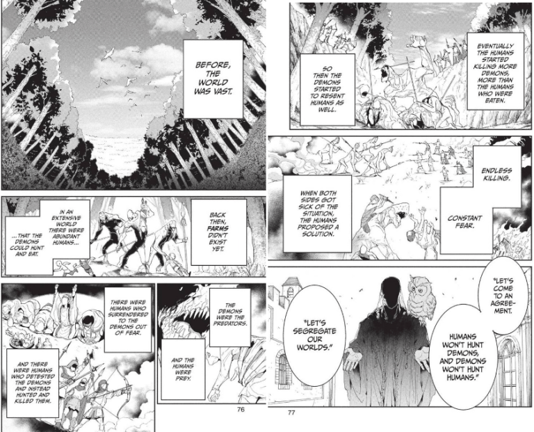 The two then talk to Sonju later on that night, trying to gain more information about the world around them and what happened to the humans that led to their situation. Sonju not only corrects them on when exactly it happened in the past (1000 years instead of 30), he goes into great detail of the one event which started it all: the promise between humans and demons. As far as adapting this scene goes, while the anime excellently sets the mood for realizing that the kids are living in their worst-case-scenario, the manga is able to give a more visual view of the past as it went throughout Sonju’s narration.