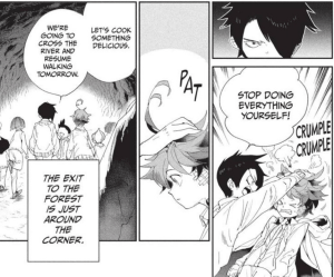 As they continue to evade Grace Field’s pursuers, the children spend the next few days traveling underground while learning more survival skills from their demon friends. Ray and Emma tell the rest on what they found out and add in crossing over to the human world as part of their goals after finding William Minerva. The kids readily agree to it, but not without scolding both of them for their reckless actions beforehand. Looking back when I read this scene and enjoyed it as a good comedic moment to break the tense action from previous events, but now there’s also a greater appreciation for how it strong the care and support system Emma and Ray have from their family.