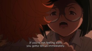 Now, with the first omitted scene I mentioned before, this took place after Emma and Ray got scolded by the other children. Mujika and Sonju talk after watching all that happen, and Mujika asks, in demon language, why Sonju hasn’t been completely truthful to them when it came to certain aspects of the promise. I have no idea if this was omitted because the anime is actually trying to avoid demon language being spoken, or if this is just something to add when we find out Sonju’s true motives for helping the kids. If it’s the latter, it would certainly make that plot twist about him even more dramatic next episode.