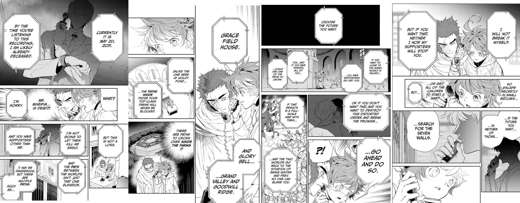 Now with the first two scenes, the call recording from Minerva was mostly intact for the information he had about himself, and the rest of it was either recontextualized from its original location in Goldy Pond, but the mention of the new location D100 also removes mentions of the promise, the role he played with the system and the paths in the farms that cross over to the human world, at least for the meantime. Best case scenario, if the kids arrive to that location, that’s probably where at least some of the information is given. Another thing to note is that D100’s location is that it’s coordinates would put it further west of Grace Field, and it has been stated that the Lambda facility was also located somewhere in the west.